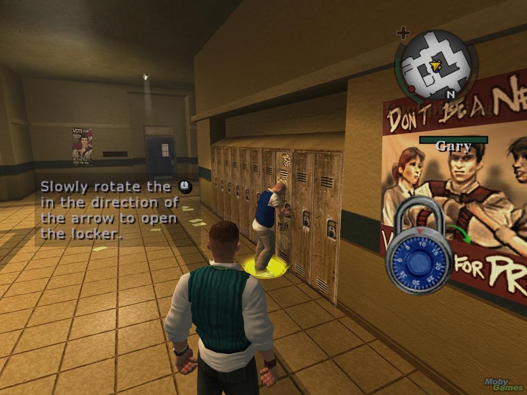 Players use melee attacks and weapons to fight enemies,and may run, jump, swim or use vehicles to navigate the game's world.Bus stops are located in various locations around the world, allowing players to quickly travel back to Bullworth Academy. Should players take damage, their health meter can be fully regenerated using multiple techniques, such as drinking sodas. If players break rules while playing, the game's authority figures may respond as indicated by a "trouble" meter in the head-up display (HUD). On the meter, the displayed levels indicate the current level of severity (for example, at the maximum sixth level, efforts by all authority figures to incapacitate players become very aggressive). Authority figures will search for players who escape their line of sight; the trouble meter enters a cooldown mode and eventually recedes when the player has evaded the authority figures.